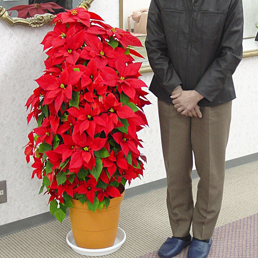 高さ1mのギフト用鉢植えポインセチア「タワー9号・レッド」お歳暮・クリスマスの通販ギフトにオーク・リーフの希少ポインセチアはいかがですか。鉢花・観葉・多肉の経験豊かなスタッフが心を込めてお届けします。