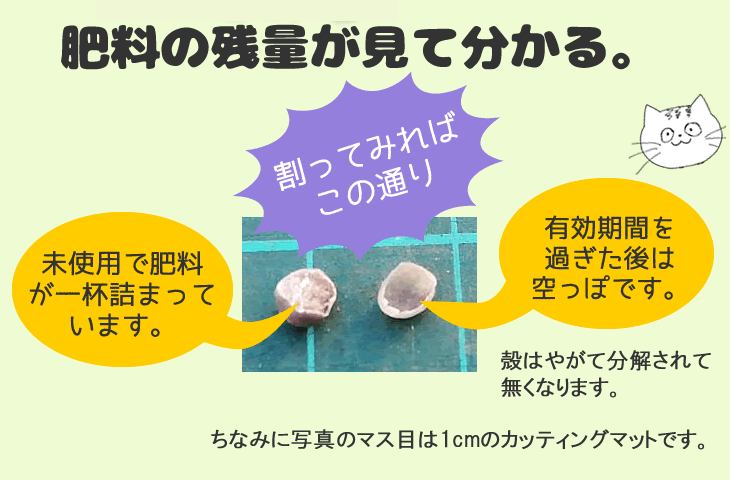一般的に化成肥料は、固形物質に肥料成分を浸み込ませてあります。肥料分がすっかり溶け出しても固形物はそのままなため、外見では肥料が切れたかどうかははっきり分かりません。しかし「育て力ーB180」のコーティング肥料は写真の通り割ってみると、肥料がなくなると空っぽになっています。「一目瞭然」とても分かりやすいですね。